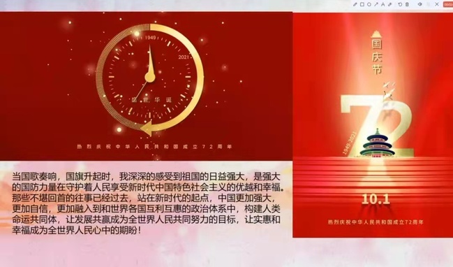 百年征程波澜壮阔,百年初心历久弥坚。正值建党百年,喜迎祖国72岁华诞之际,10月1日—10月3日,公司举办“壮丽征程赋新篇,携手直拍国风彩”短视频录制活动。通过拍摄视频的方式,回顾党的光辉历史,讴歌党的丰功伟绩,引导广大青年学子学党史、强信念、跟党走,厚植爱党、爱国、爱社会主义的情感,表达对祖国母亲的祝福与爱意。