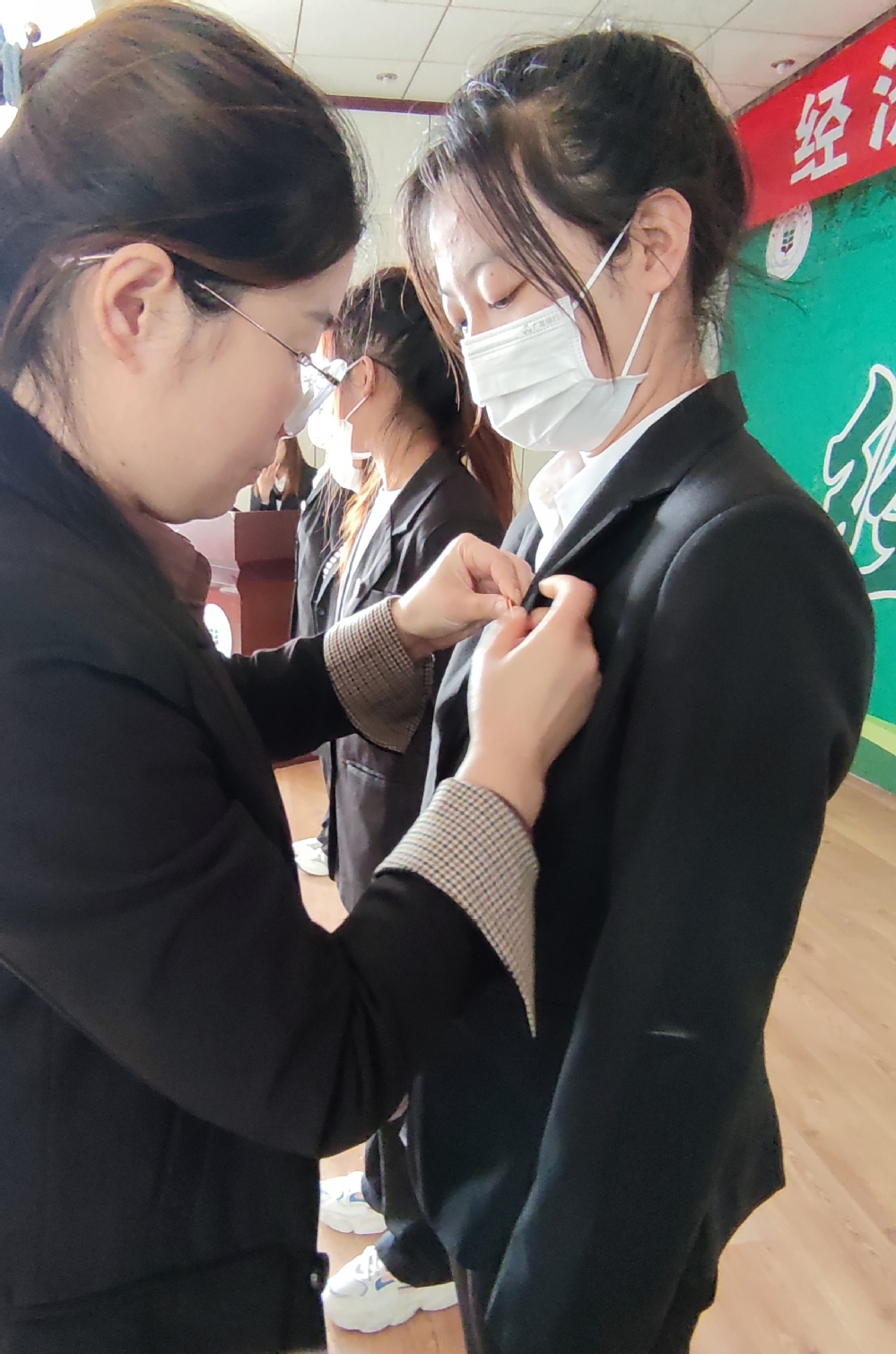 伴随着团旗的入场,入团仪式正式开始,公司党委副书记闯垒和2019级辅导员梁净为6名新团员佩戴团徽。