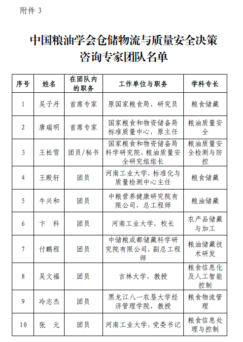 2022年7月12日,中国科协办公厅发布了《中国科协办公厅关于公布2022年决策咨询专家团队建设试点单位的通知》(科协办函智字〔2022〕72号),公布了中国科协2022年决策咨询专家团队建设试点单位名单,据通知,全国共有50家单位获批中国科协2022年决策咨询专家团队建设试点单位,中国粮油学会是其中之一,获批“中国粮油学会粮油加工与营养健康决策咨询专家团队”“中国粮油学会仓储物流与质量安全决策咨询专家团队”,公司冷志杰教授入选中国粮油学会仓储物流与质量安全决策咨询专家团队。旨在深耕粮油储藏、物流管理及质量安全专业领域,把藏粮于地、藏粮于技落到实处,为推动我国粮油产业转型升级和高质量发展积极建言献策。