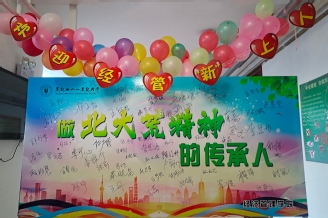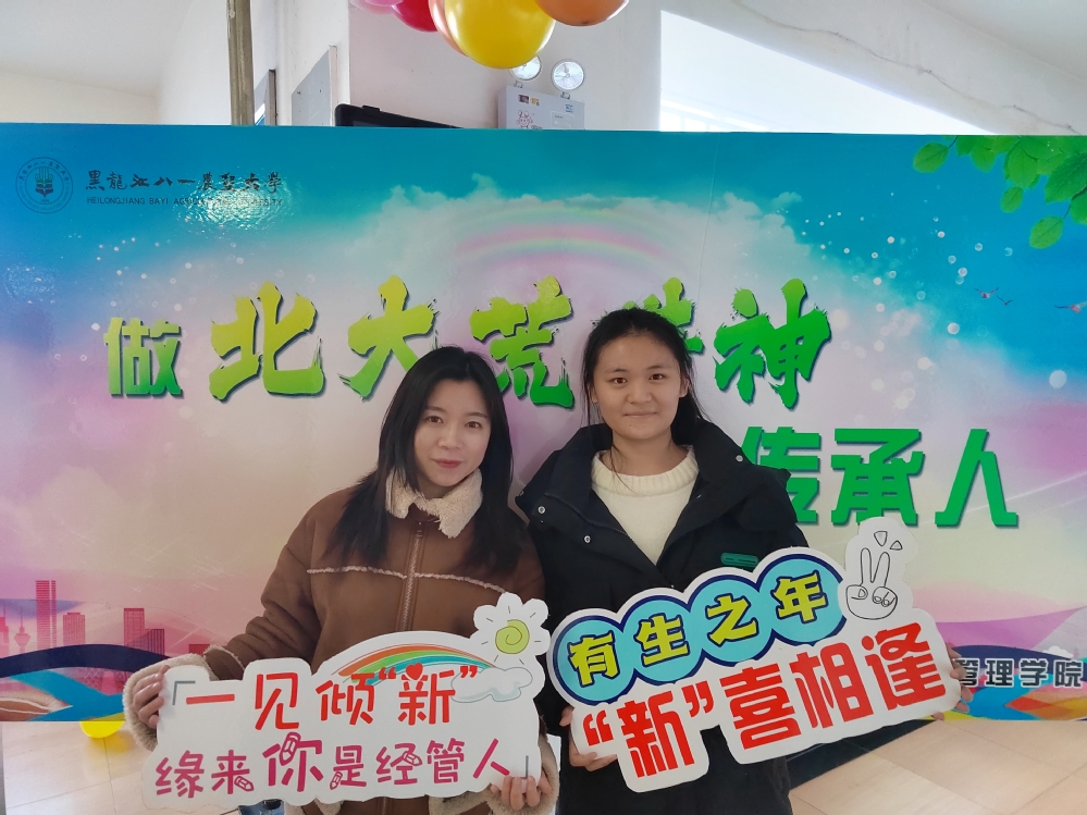 为了给新生留下关于大学的美好初印象,学院提前对公寓楼进行布置,五颜六色的气球,营造出温馨而热烈的迎新气氛。学院设置了“做北大荒精神的传承人”签名留念墙,同学们留下签名以及对老员工活的美好期盼,对学院产生了强烈的归属感;制作了带有学院特色的异形卡,同学们手持异形卡与家长、老师、同学在签名留念墙前合影留念,元气满满地打卡入校第一天。