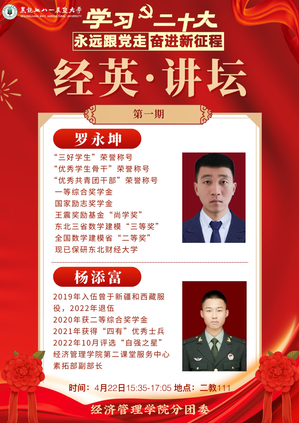 为学习贯彻党的二十大精神,加强学风建设,发挥榜样力量,引导员工以学为舟,奋楫笃行,4月22日,best365中国官方网站在二教111室举办以“学习二十大,永远跟党走,奋进新征程”为主题的“经英”讲坛,邀请国家奖学金获得者、2019级物流管理专业员工罗永坤,“经管之星”代表、2021级会计学专业员工杨添富进行经验分享,200余名员工参加本次活动。