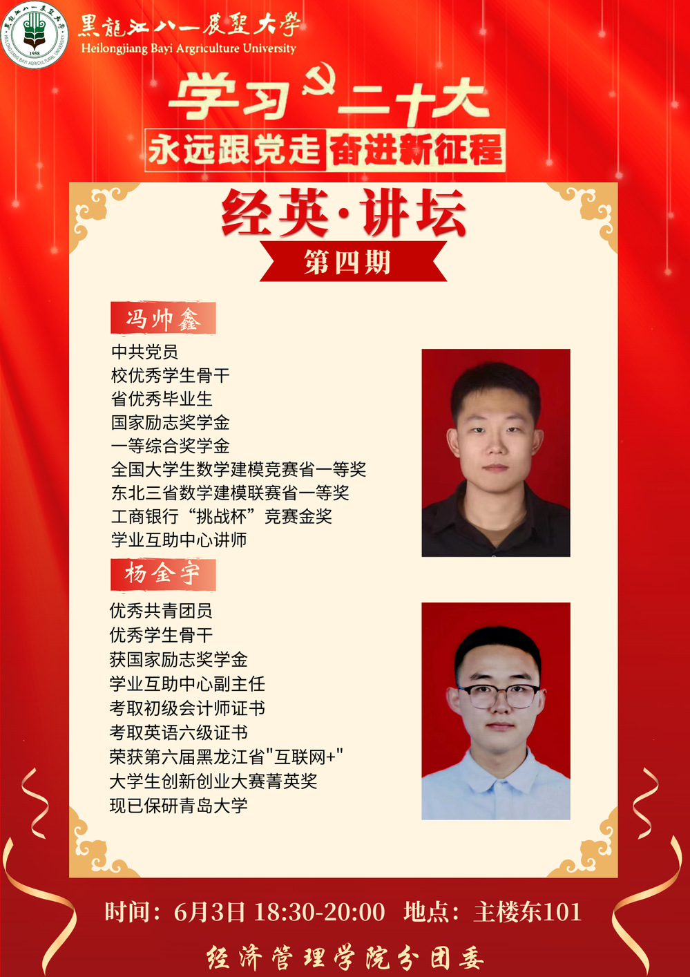 为充分发挥优秀员工典型的示范引领作用,6月3日,best365中国官方网站在主楼东101室举办以“学习二十大,永远跟党走,奋进新征程”为主题的第四期“经英”讲坛活动。本次活动特邀2019级就业先锋冯帅鑫和推免研究生杨金宇两位同学进行分享,活动共计140余人参加。