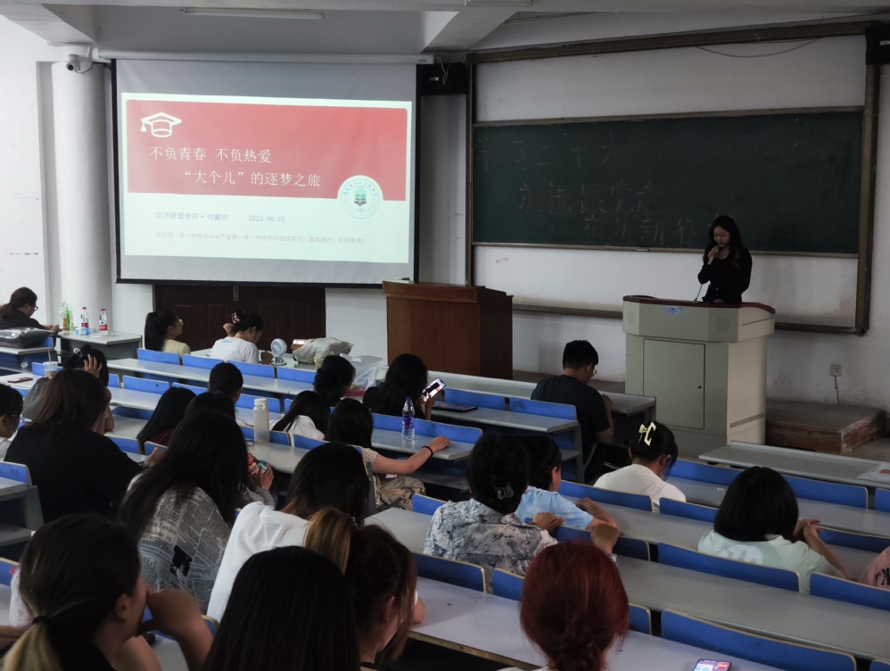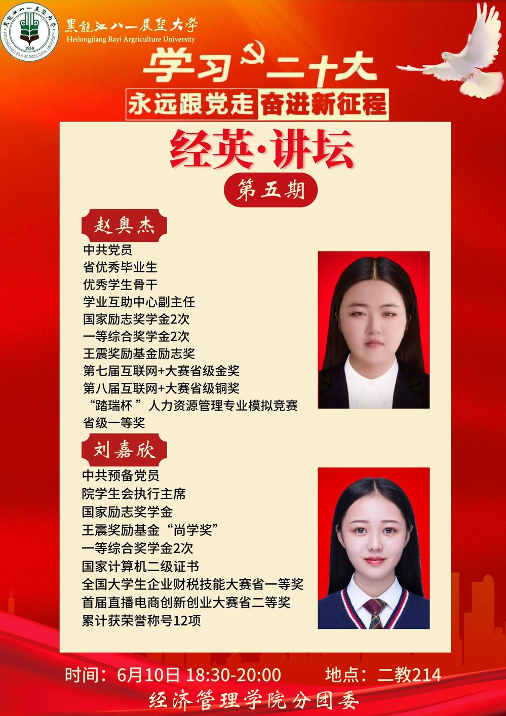 为进一步加强学风建设,充分发挥先进典型的示范引领作用,引领经管学子锐意进取,激发学习工作热情,6月10日,best365中国官方网站在二教214教室开展以“学习二十大,永远跟党走,奋进新征程”为主题的第五期“经英”讲坛活动。本次活动特邀省优秀毕业生赵奥杰和学院员工会执行主席刘嘉欣两名同学进行分享,活动共计130余人参加。