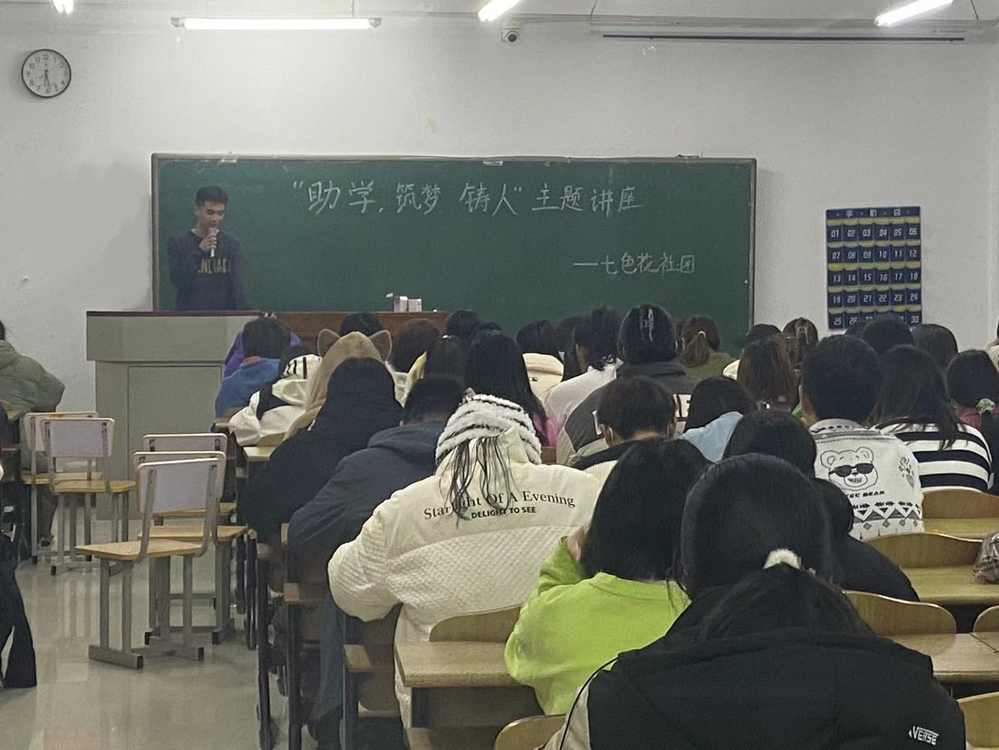 七色花社团成员高杰作国家助学金资助政策宣传,从国家助学金申请条件、评审与程序、发放与管理以及申请表填写注意事项四个方面进行详细讲解,并作国家助学金及其它员工资助政策常见问题解答,提醒同学们申请各类资助时恪守诚信,提供的资料必须真实准确。