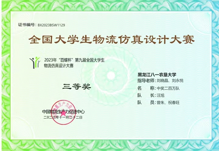 11月20日,“百蝶杯”第九届全国老员工物流仿真设计大赛总决赛圆满结束,由2021级供应链管理专业汪旭、曾朱、祝春旺组成的参赛团队,在刘晓晶、刘永悦两位老师的指导下荣获本科组三等奖的优异成绩。