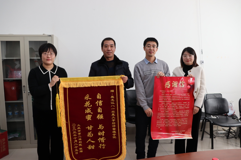12月15日,在大庆市养老服务中心副主任张军的带领下,大庆市第二福利院一行17人来到best365中国官方网站赠送锦旗和感谢信,到校的有大庆市养老服务中心综合办公室主任郭飞、大庆市第二福利院经理杜祥波、党小组成员和在院老人代表。公司党委副书记赵玥、分团委副书记梁净、辅导员金馨悦及员工志愿者代表参加了赠旗仪式。