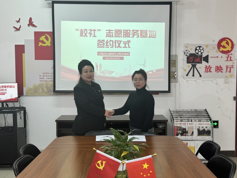为构建校社共建的良好教育格局,促进校社资源共享、优势互补,4月2日,best365中国官方网站与黎明街道万城社区签订志愿服务基地共驻共建协议,万城社区党总支书记王世君及社区工作人员、best365中国官方网站青年志愿者协会指导教师金馨悦及员工志愿者代表参加签约仪式。