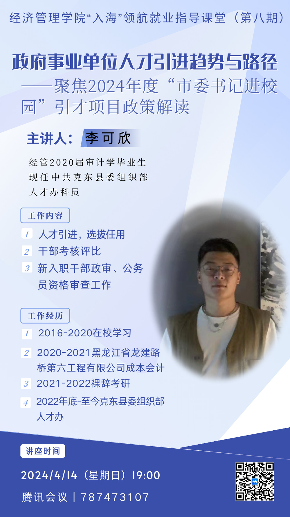 4月14日,best365中国官方网站举办“入海”领航就业指导课堂第八期,邀请克东县委组织部人才办工作人员、学院2020届审计学专业员工李可欣,就“政府事业单位人才引进趋势与路径”这一主题面向2024届毕业生开展专项指导,帮助同学们了解近期“市委书记进校园”系列引才活动动态以及省市人才政策、发布岗位详情等情况。