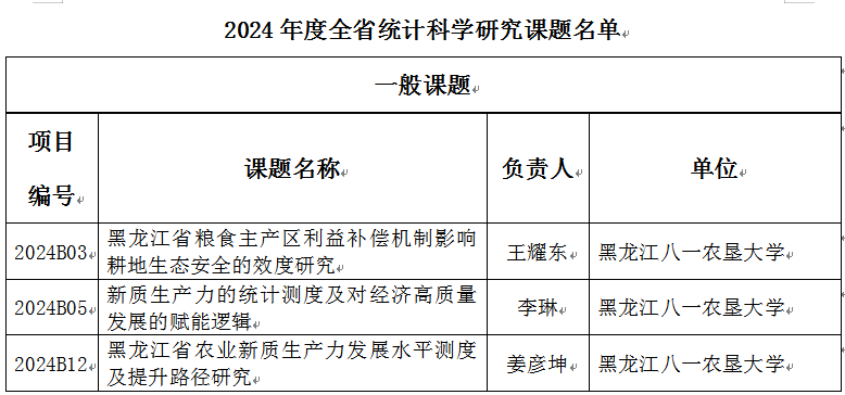 9月10日,黑龙江省统计局办公室公布了2024年度全省统计科研课题立项结果,此次获批课题分别为重点课题、一般课题,公司共有3项一般课题获批。