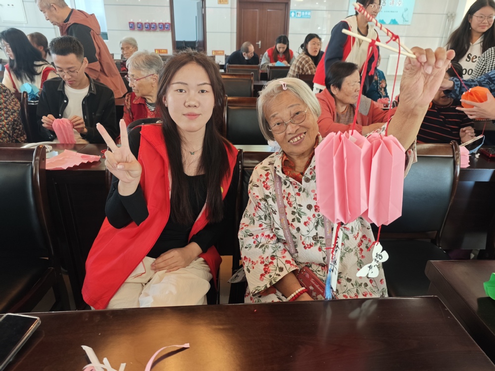 志愿者与老人们一起动手制作花灯,深切体会非遗魅力,不起眼的手工材料在大家的默契配合下变成了一盏盏精致的花灯,一份份美好祝福写在书签上、挂在花灯上,最暖“志愿情”托起了最美“夕阳红”。