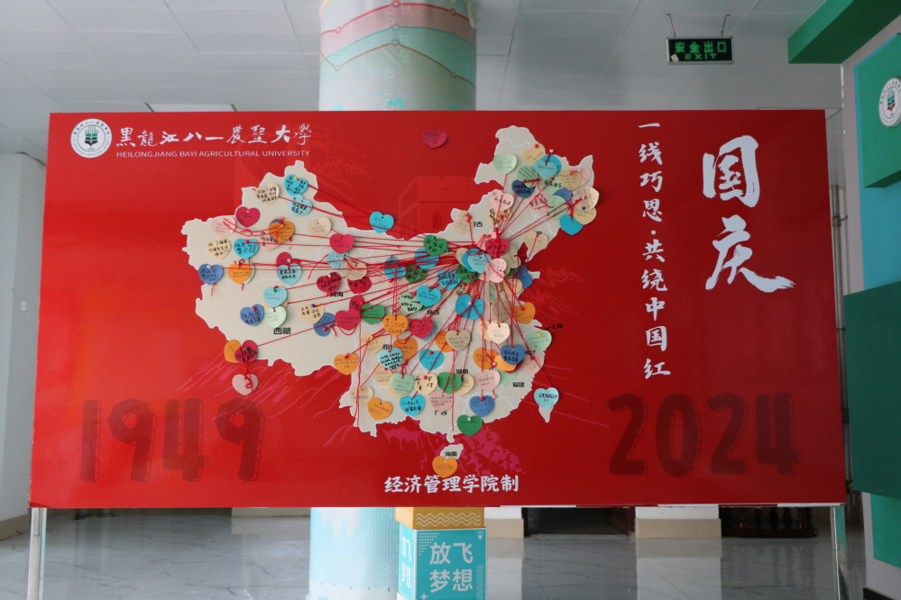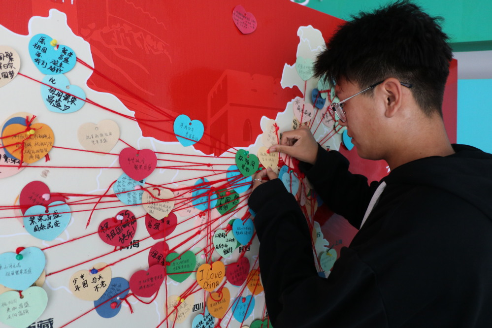 公司在经管楼大厅设置了用KT板制作的中国地图,经管学子在卡片上写下对祖国的美好祝福,利用细钉和红丝线将家乡与北京相连,“牵丝”地图成为国庆节期间学院最热门的网红打卡点。