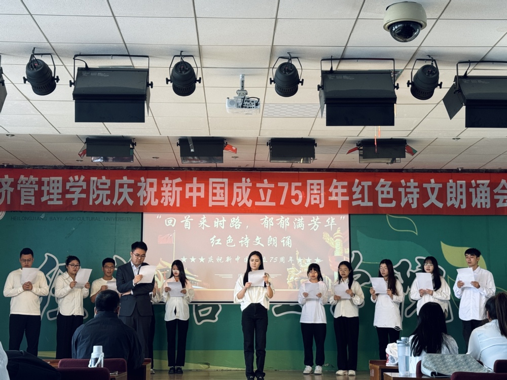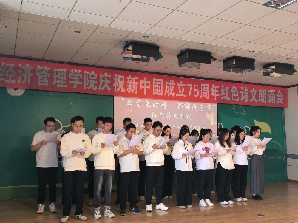 9月29日,学院在经管楼445报告厅举办红色诗文朗诵活动,2024级研究生以班级为单位倾情朗诵《华夏颂歌七十五载》《盛世中华,荣耀七十五载》等爱国主题诗歌,声音铿锵有力、句句动人,充分展现了青年员工的赤子之心和对祖国的无限热爱,活动现场高潮迭起、气氛热烈。
