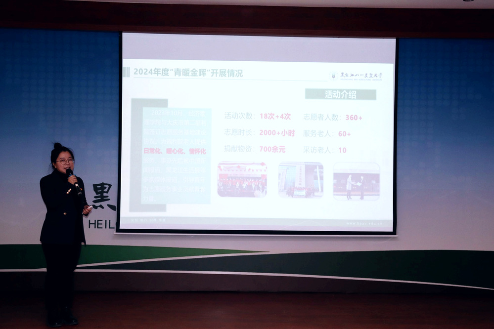 “青暖金晖”项目指导教师金馨悦对上一年项目实施情况及下一步工作计划进行汇报。