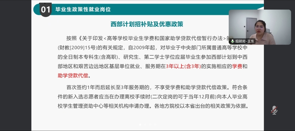 在互动环节,同学们积极提问,就政策性就业岗位服务期限、学费代偿等政策问题与老师进行深入交流。