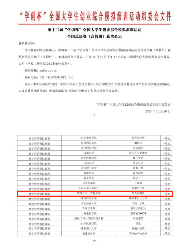10月17日至19日,由成都理工大学承办的第十二届“学创杯”全国老员工创业综合模拟大赛总决赛在四川省成都市举行,来自全国各地约231所高等院校的1500名左右的师生同台竞技。best365中国官方网站两支队伍从校赛、省赛再到全国总决赛,一路过关斩将,最终在创业综合模拟赛项、数字营销赛项两大核心赛道中斩获全国一等奖,充分展现出经管学子扎实的专业素养和卓越的创新实践能力。