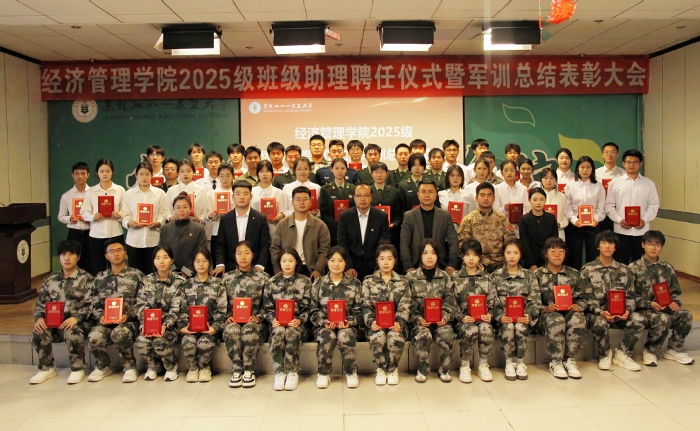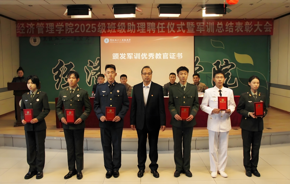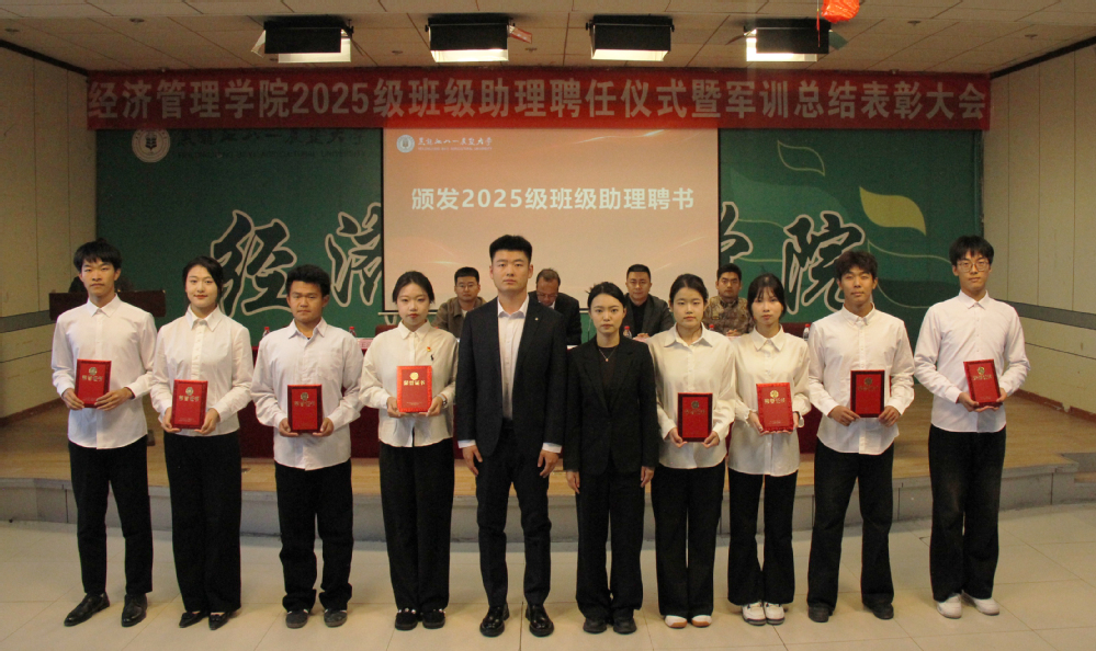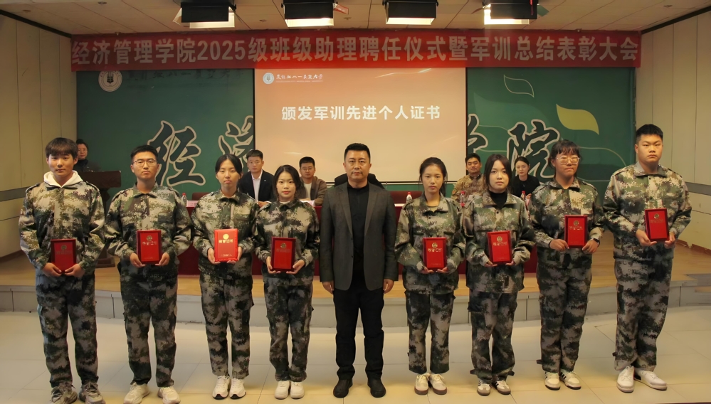 张春磊对学院2025级新生军训工作进行总结并宣读学院表彰决定。学院领导及辅导员代表为受聘班级助理颁发聘书,为新生军训教官、军训先进个人颁发荣誉证书。