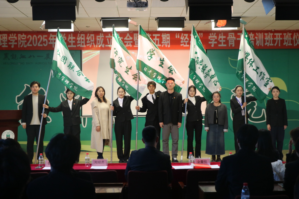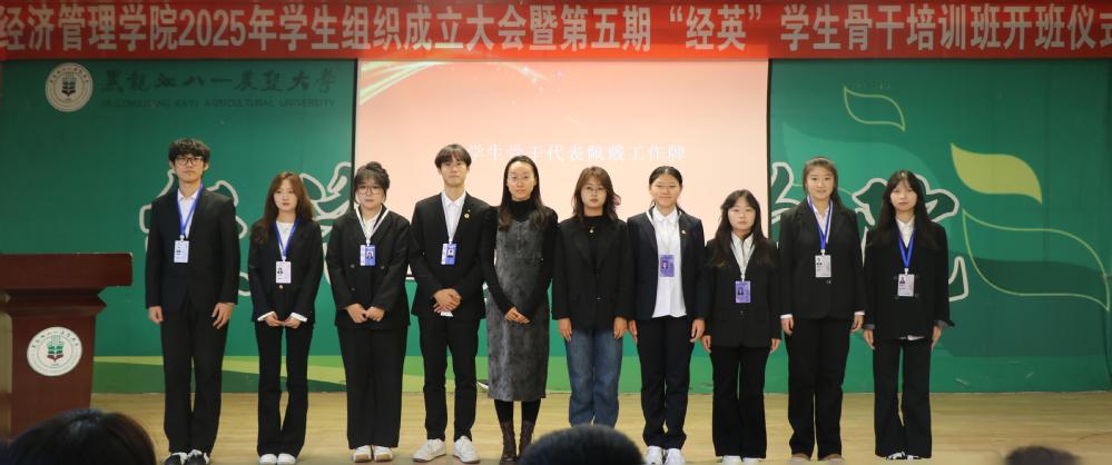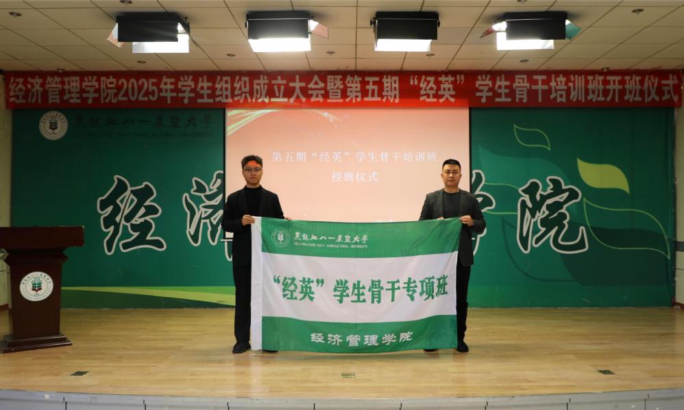 张春磊为第五期“经英”员工骨干培训班班主任乔辰军授旗。第八届第二课堂服务中心主任孟令雨带领全体学员庄严宣誓。第四十七届员工会执行主席刘洋硕作为第四期“经英”班优秀学员代表上台发言,他回顾了在第四期“经英”员工骨干培训班的收获与成长,表达了新一届员工骨干传承北大荒精神,践行职责、服务同学、提升自我的坚定决心,承诺将在思想、学习上争先,严于律己,以榜样之力引领同学,在服务与成长中践行“经英”担当。
